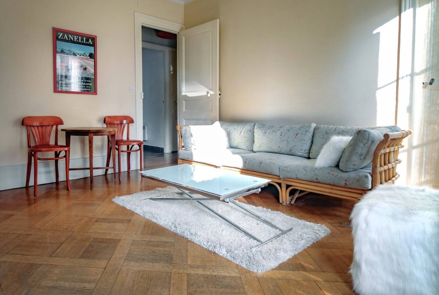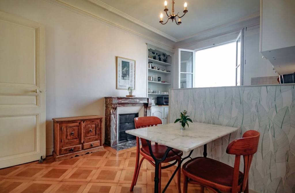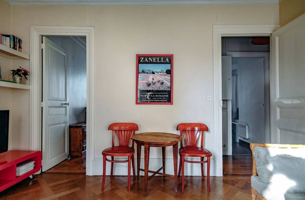 Located on the 4th floor -with elevator- of a typical parisian residential building, the apartment is 55 square meters (600 square feet) with parquet floors and fireplaces.